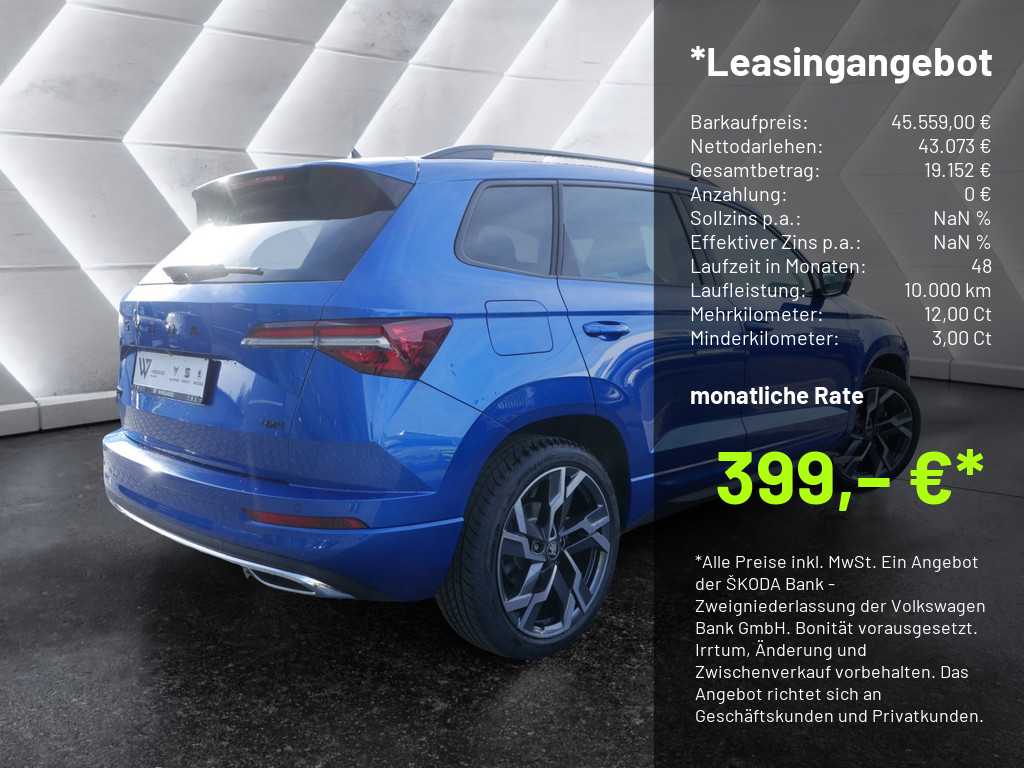 Ein unverbindliches Leasingangebot der ŠKODA Bank - Zweigniederlassung der Volkswagen Bank GmbH, Gifhorner Straße 57, 38112 Braunschweig. Das Angebot richtet sich an Privatkunden und Geschäftskunden. Alle Preise inkl. 19% Mehrwertsteuer. Fahrzeugpreis: 45.559,00 EUR, Nettodarlehensbetrag: 43.073,30 EUR, Einmalige Leasingsonderzahlung: 0,00 EUR, Laufzeit: 48 Monate, Laufleistung p.a.: 10.000 km, monatliche Leasingrate: 399,00 EUR, Gesamtbetrag: 19.152,00 EUR (Summe aus Leasingsonderzahlung und monatlichen Leasingraten), Minderkilometer: 3,30 Cent/km, Mehrkilometer: 11,52 Cent/km, Freigrenze: 2.500 km.